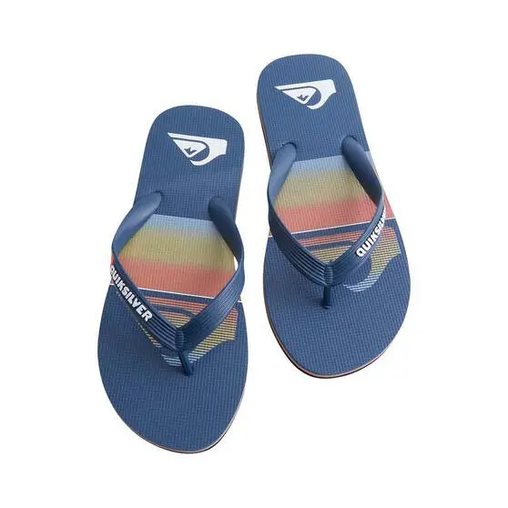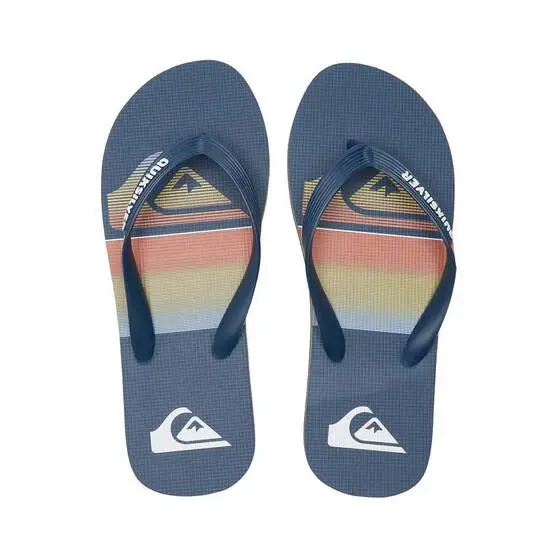 Say aloha to the Quiksilver Molokai Slab Thongs . Featuring a flexible 3-point synthetic rubber sandal strap for the ultimate support, slip-resistant textured insoles to keep your feet where they should be, and a blown rubber outsole with multi-angled logo lugs for traction to keep you from falling like a tonne of bricks, the QQuiksilver Molokai Slab Thongs will be your top pick for any trip; from the epic getaway with mates to popping down to the shops.